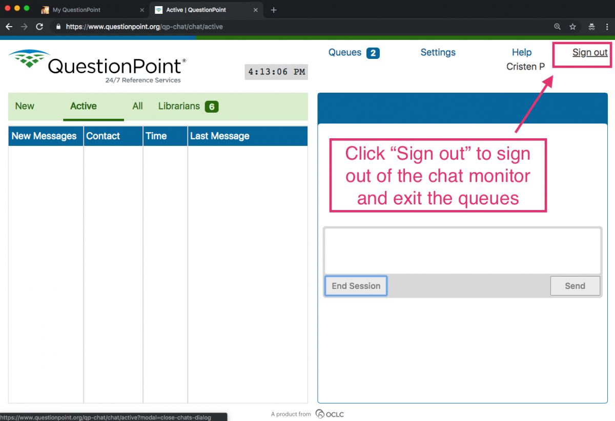 If you're unsure if you've signed out of the queues, you can always check the Chat Monitoring Tool on the QuestionPoint main page where you first launch the chat (on the left-hand side under Quick Links).